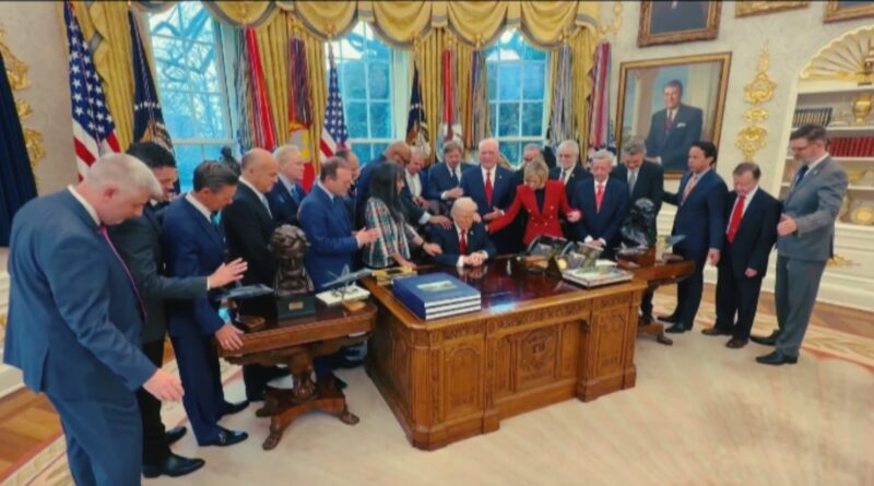 হোয়াইট হাউসের থেকে প্রকাশিত একটি ভিডিওতে দেখা যায়, প্রেসিডেন্ট ট্রাম্পকে মাঝখানে রেখে ঘিরে দাঁড়িয়েছেন প্রায় ২০ জন। প্রার্থনায় অংশ নেন পলা হোয়াইট কেইন, ডালাসের ফার্স্ট ব্যাপটিস্ট চার্চের পাস্টর রবার্ট জেফ্রেস, ফেইথ অ্যান্ড ফ্রিডম কোয়ালিশনের রাল্ফ রিড এবং ফ্যামিলি রিসার্চ কাউন্সিলের গ্যারি বাউয়ারসহ অন্যান্যরা। সূত্রের খবর ইরানের বিরুদ্ধে চলমান যুদ্ধে আমেরিকার সাফল্য কামনা করে প্রার্থনা করেন তারা ।